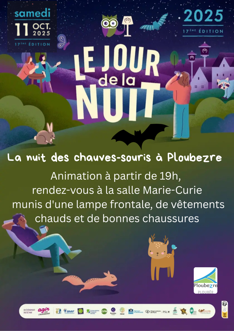 Cette année, une animation sera proposée à 19H00 pour observer les chauve-souris dans le centre-bourg (avec le soutien du Groupe Mammalogique Breton, https://gmb.bzh). Nous commencerons par la projection d’un film la salle Marie Curie (durée environ 10 min), puis déambulation à la lampe frontale autour de la mairie. Prévoir des vêtements chauds, de bonnes chaussures et une lampe frontale !