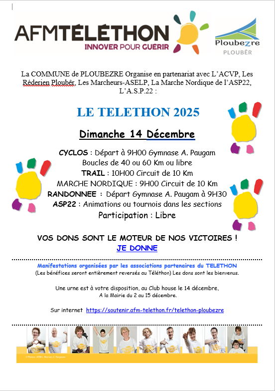 La commune de Ploubezre organise en partenariat avec l’ACVP, les Réderien Plouber, les Marcheurs ASELP, la Marche Nordique de l’ASP22, et l’ASP22 Le TÉLÉTHON 2025 le 14 décembre 2025.