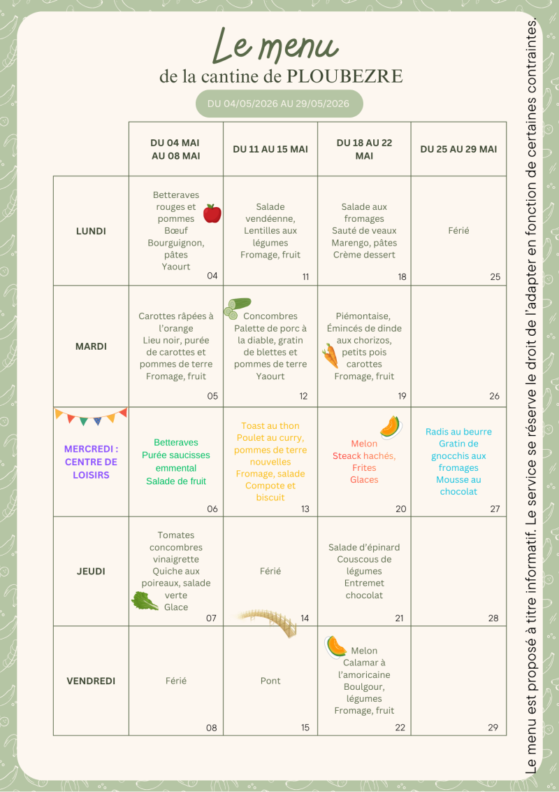 Accueil > Actualités > Le Menu de la cantine pour le mois de Mai